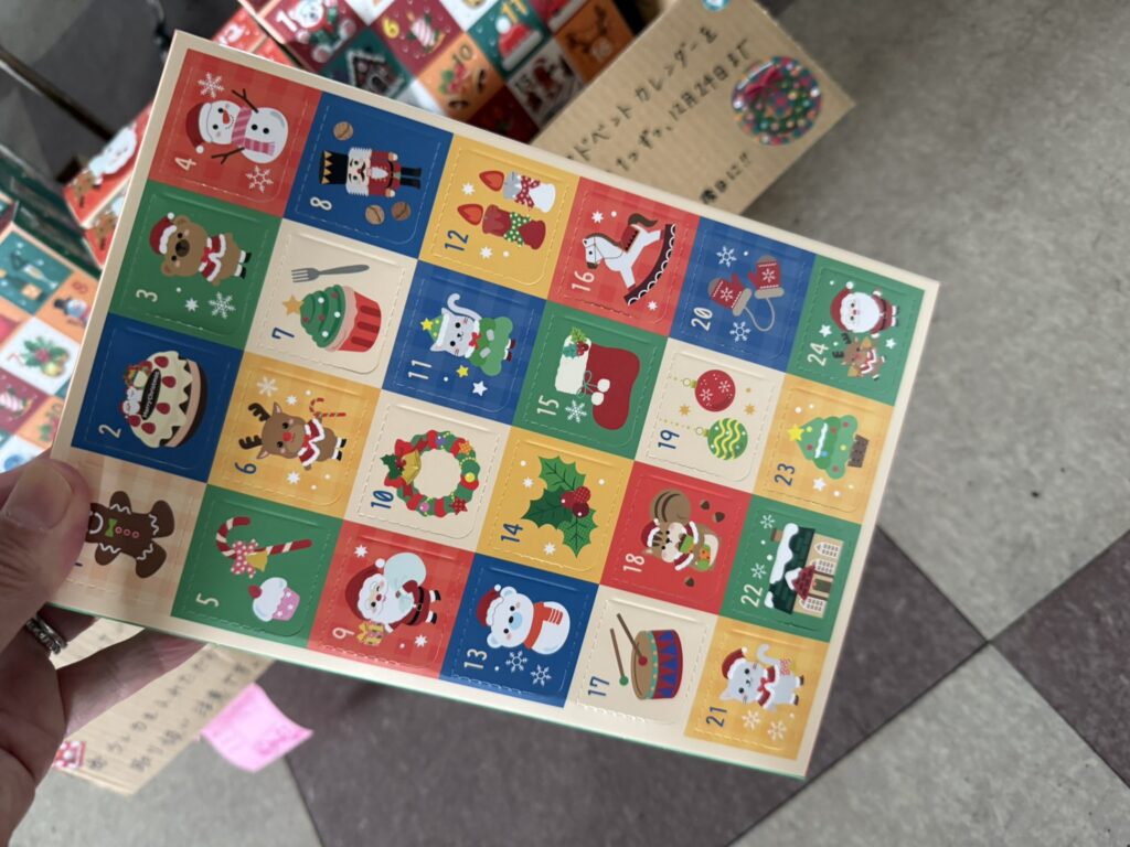 『アドベントカレンダーとは、クリスマスの到来を心待ちにするための、12月1日から24日(または25日)までの期間限定カレンダーです。日付ごとに開けられる窓やポケットがついており、毎日1つずつ開けると、お菓子や小さなプレゼントなどが入っていることが一般的です。 』(Google検索のAIによる要約から引用)