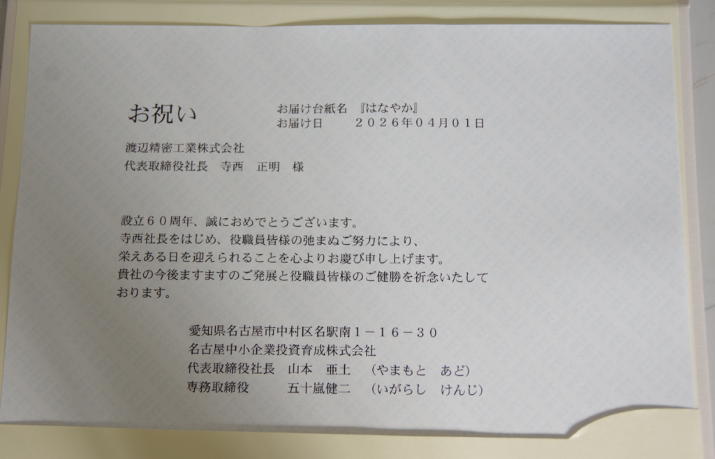 なお、この節目にあたり、お花や祝電をお送りいただきました皆様にも、心より御礼申し上げます。温かいお心遣いに、改めて感謝いたします。